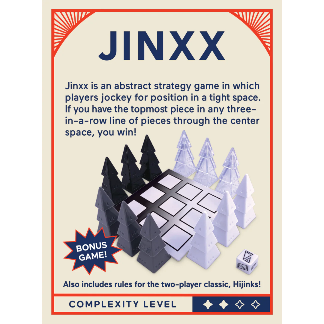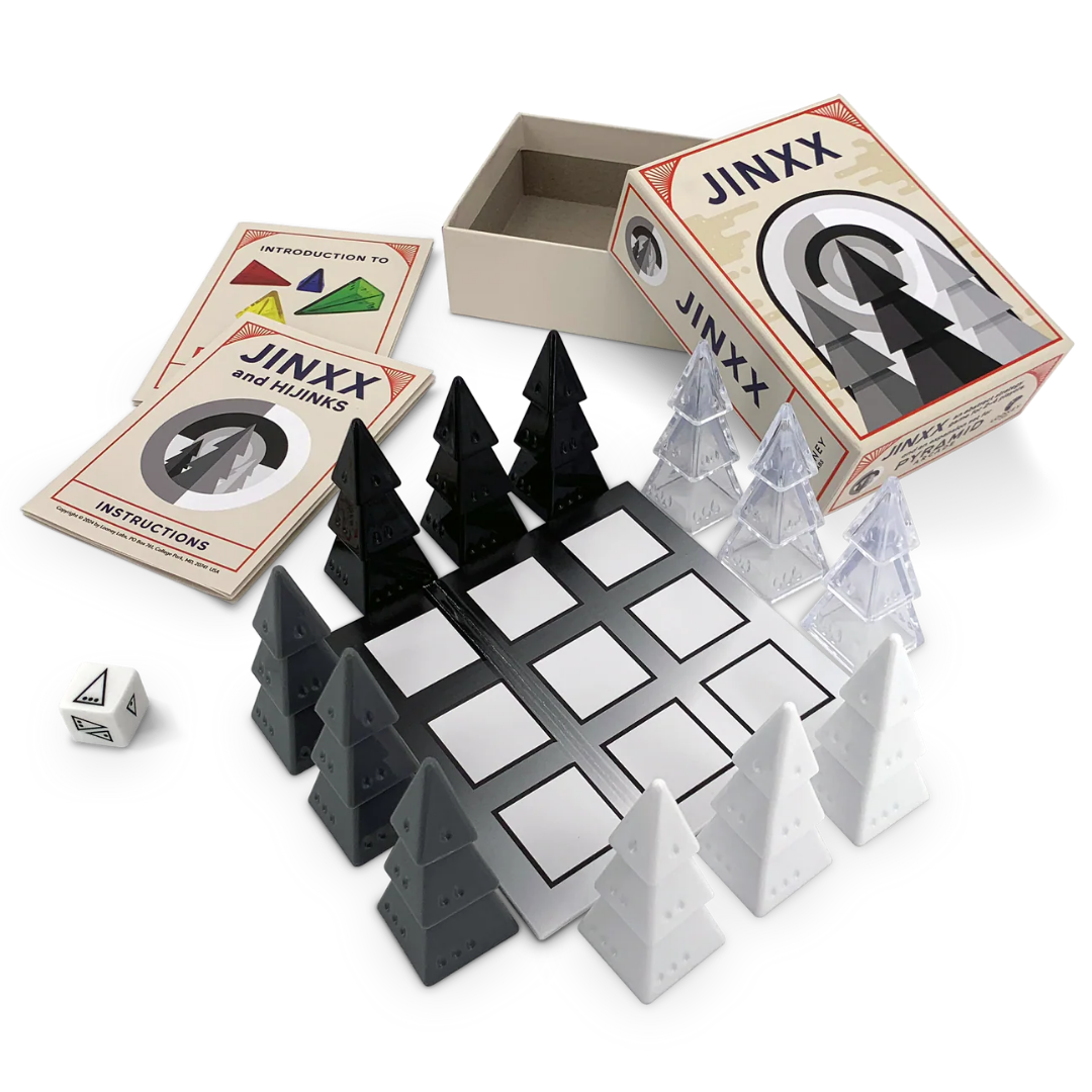 Jinxx is an abstract strategy game for 2-4 players featuring striking stacking pyramid-shaped pieces in three sizes and four colors--black, white, gray, and clear. In Jinxx, players jockey for position on a 3x3 grid. Pyramid size and a die roll determine your possible moves on each turn. Use your move to capture an opponent's piece or better position one of your own pieces. If you own the topmost pyramids in any three-space line through the center, you win! But be careful — you can also be eliminated if you lose too many of your pieces!