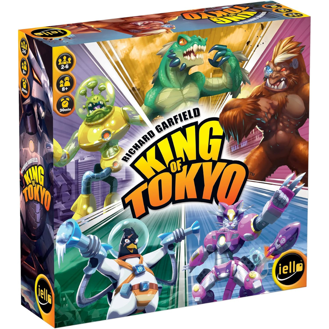 King of Tokyo is a game for 2 to 6 players where you play as mutant monsters, rampaging robots, or even abominable aliens battling in a fun, chaotic atmosphere. Roll dice and choose your strategy: Will you attack your enemies? Heal your wounds? Improve your Monster? Stomp your path to victory!