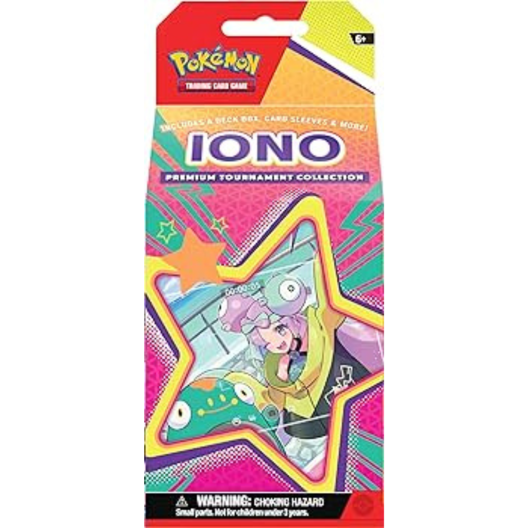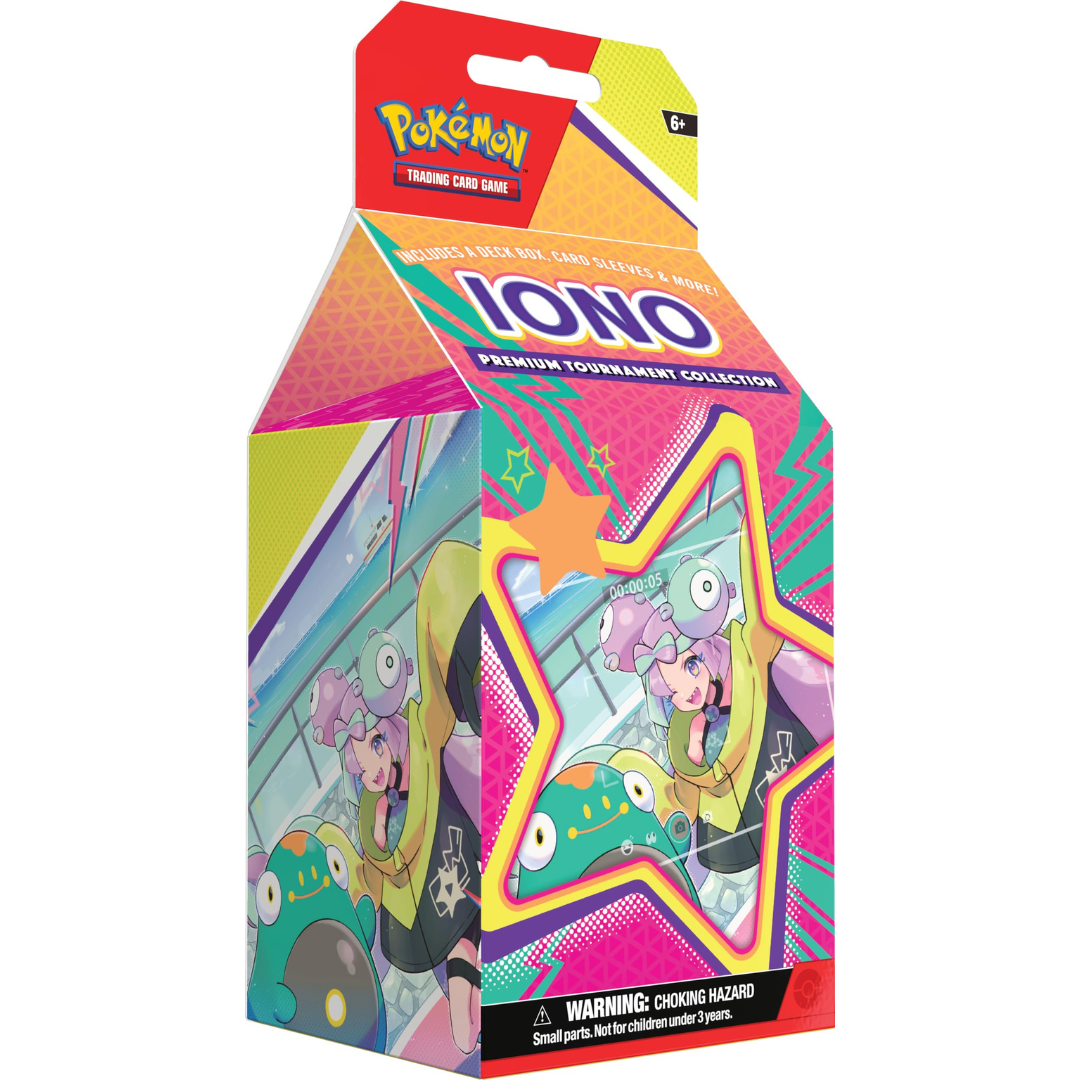 - The Pokémon TCG: Iono Premium Tournament Collection includes 1 full-art foil Supporter card featuring Iono, 3 additional foil Supporter cards featuring Iono, and 65 card sleeves featuring Iono.
