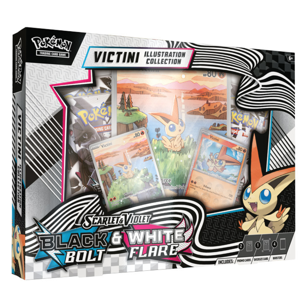 Borrow a mythical Pokémon’s power! The Mythical Pokémon Victini is said to create infinite energy that it can share with its friends, and now you can team up with it in your own Pokémon TCG decks! In this collection, you get an illustration-rare-style foil promo card and a premium parallel foil card featuring Victini, along with an oversize card for display. You’ll find even more Pokémon from the Unova region inside the included booster packs from the special Scarlet & Violet—Black Bolt and Scarlet & Violet—White Flare expansions.