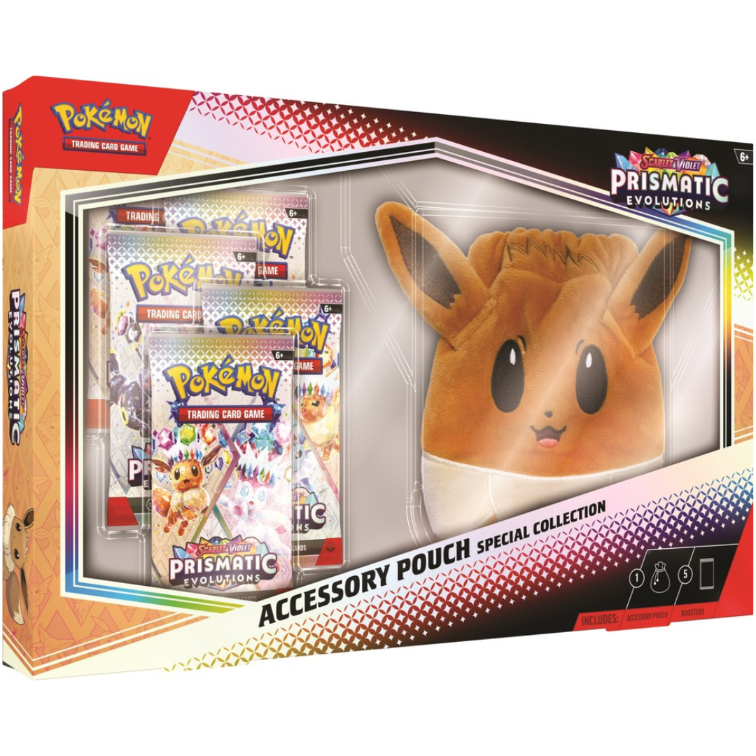 The Pokemon TCG: Scarlet & Violet - Prismatic Evolutions Accessory Pouch (Special Collection) includes a fun accessory pouch based on Eevee, and 5 Pokemon TCG: Scarlet & Violet - Prismatic Evolutions booster packs.