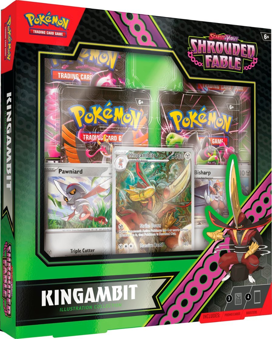 Kingambit brings down the big blade! Kingambit overcomes all challengers to become the leader of its own army! With this noble collection, you can add the Big Blade Pokémon to your team as an illustration rare-style promo card, joined by foil cards featuring Pawniard and Bisharp. You’ll also find four booster packs from the special Scarlet & Violet—Shrouded Fable expansion!