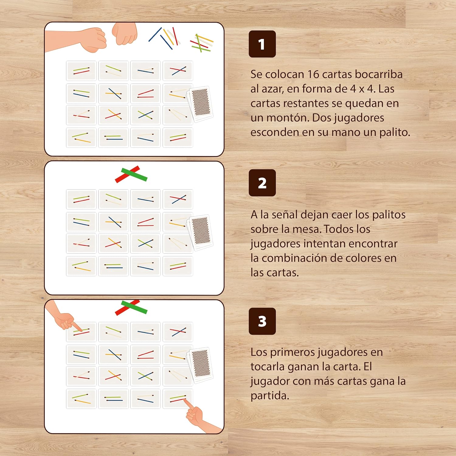 The game of speed and colors - Place 16 cards on the table in a 4 x 4 square. At the beginning of each round, 2 players pick one stick each (secretly) and place their draw hand in the air above the cards.On the count of 3, the players holding the matches release them on the table. Now, all players try to be the first to tap the card(s) showing the same color combination. Players collect the cards they were the first to tap and place them on their score piles. The player who collects the most cards wins the game.