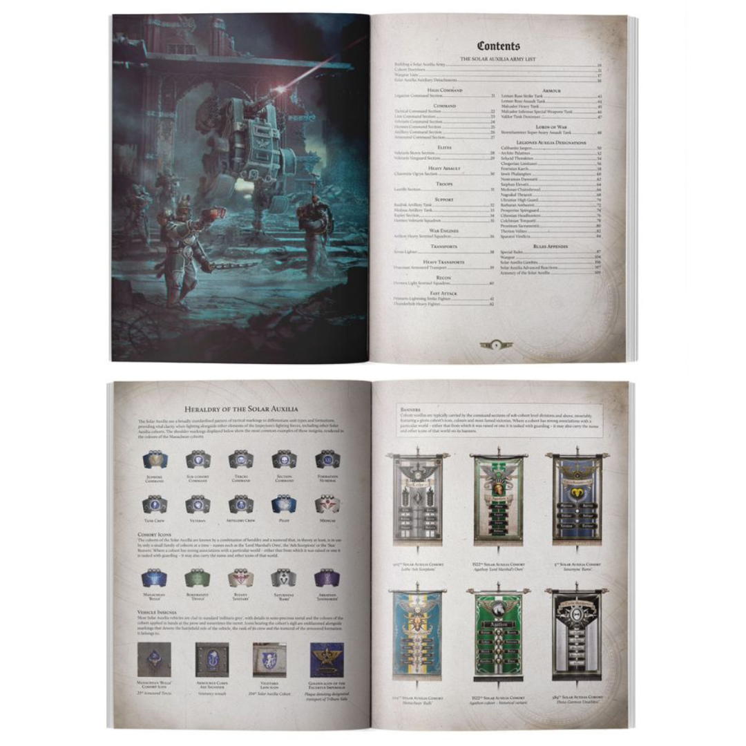 – Rules and unit profiles: A guide to army building, Doctrines, and Detachments, plus rules for units, weapons, and Wargear available to the Solar Auxilia in Warhammer: The Horus Heresy.