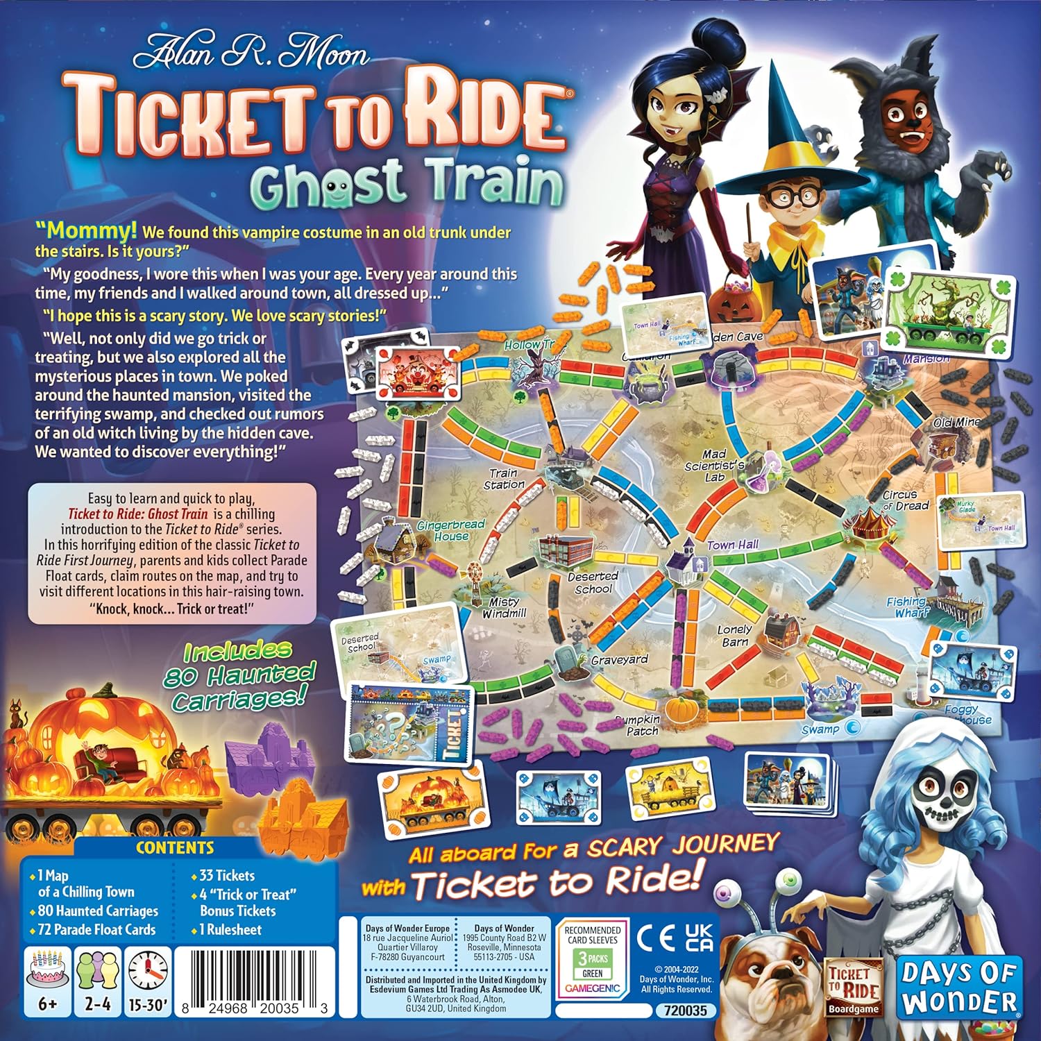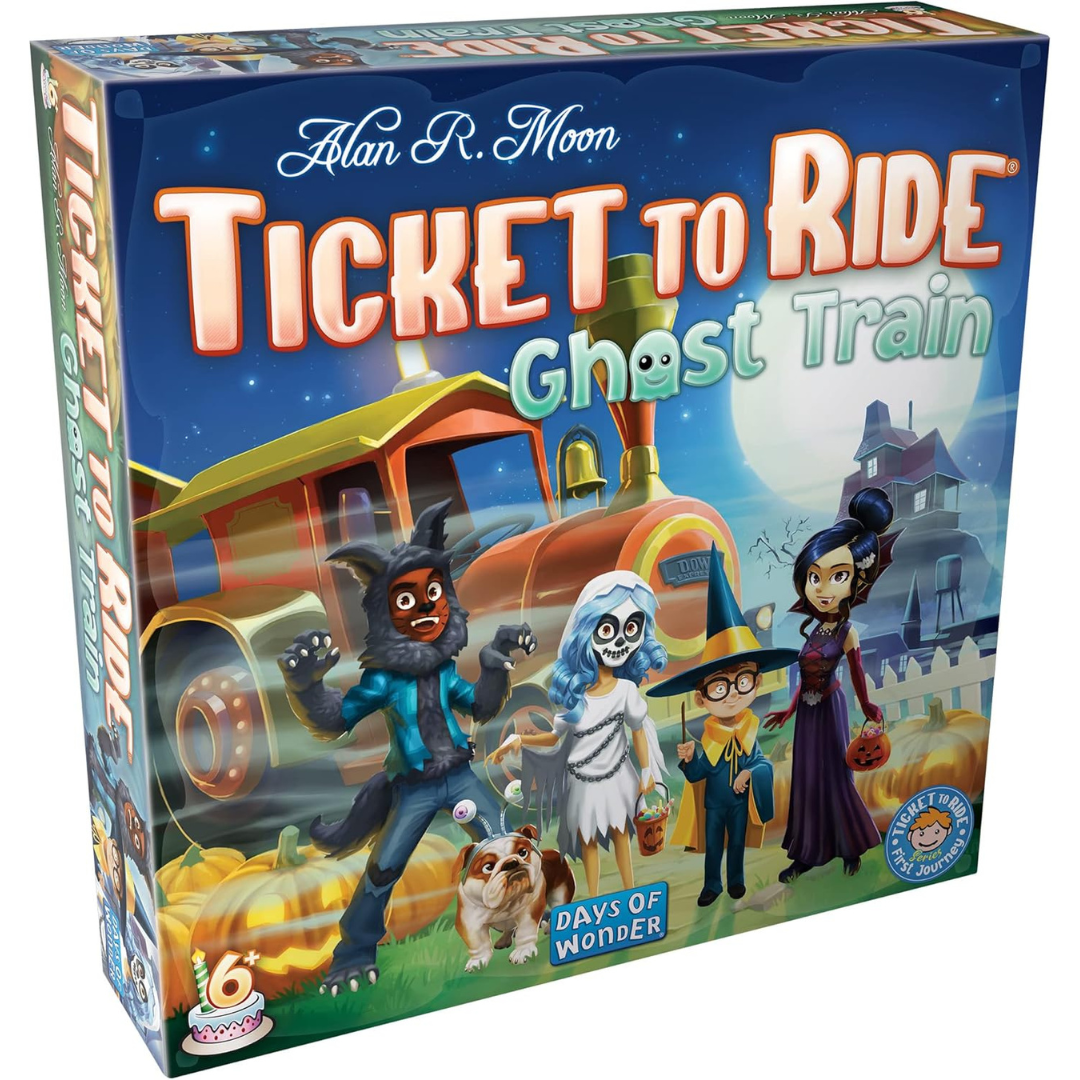 All aboard for a scary journey with Ticket to Ride: Ghost train. Easy to learn and quick to play, Ticket to Ride: Ghost Train is a chilling introduction to the Ticket to Ride series. In this horrifying edition of the classic Ticket to Ride First Journey, parents and kids collect Parade Float cards, claim routes on the map, and try to visit different locations in this hair-raising town.